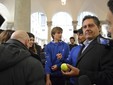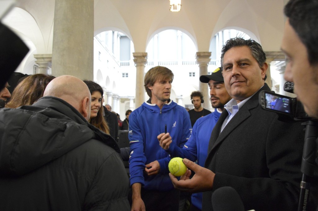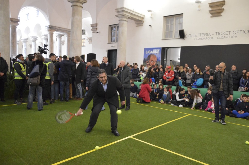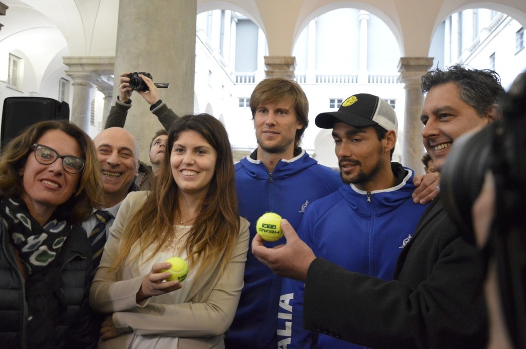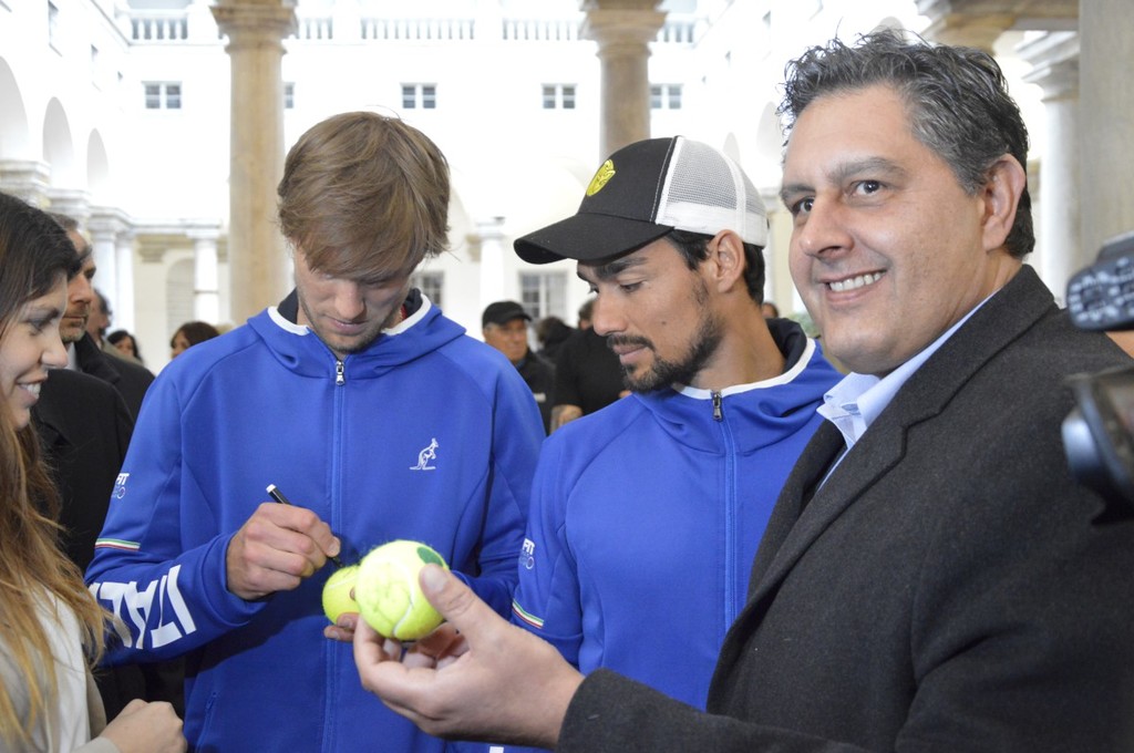 Anche il governatore ligure Giovanni Toti ha agguantato la racchetta. "Abbiamo coinvolto la città in un evento che non è solamente sport, ma è anche costume, dà vivacità a Genova e attira turisti. Un momento straordinario. E' straordinaria la folla di bambini e l'entusiasmo con cui stanno seguendo i campioni nel campo a Palazzo Ducale, per dare il benvenuto alla nostra squadra di Davis. Tifiamo tutti per Fabio Fognini e Andreas Seppi".