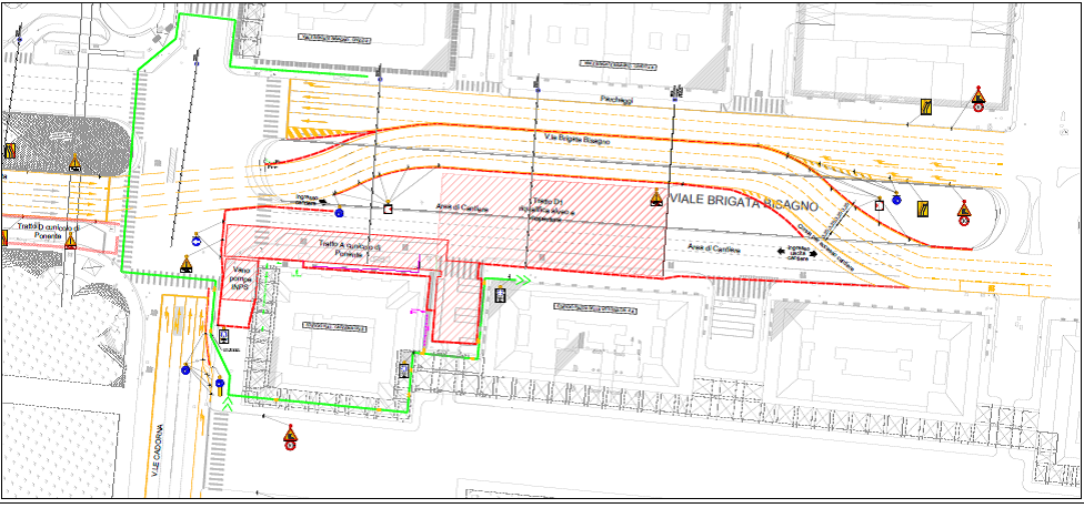 Saranno effettuate modifiche alla viabilità in viale Brigata Bisagno direzione mare, come rappresentato nell'immagine: il traffico verso mare seguirà un andamento adiacente al cantiere mantenendo quattro corsie di marcia.
