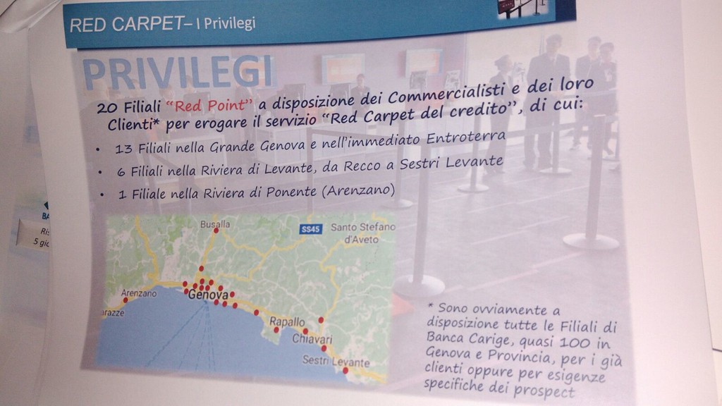Gianluca Guaitani, chief commercial officer di Banca Carige, e Paolo Ravà, presidente dell'Ordine Dottori Commercialisti e degli Esperti Contabili Genova, hanno firmato oggi presso il Teatro Carlo Felice l'accordo "Red carpet del credito". Una sinergia per il sostegno all'economia locale, che mette a disposizione delle aziende un canale snello e privilegiato per l'accesso al credito. Si rivolge ai clienti del commercialista e abbraccia l'intera gamma dei finanziamenti bancari concedibili da Carige, sia a breve che a medio-lungo termine.