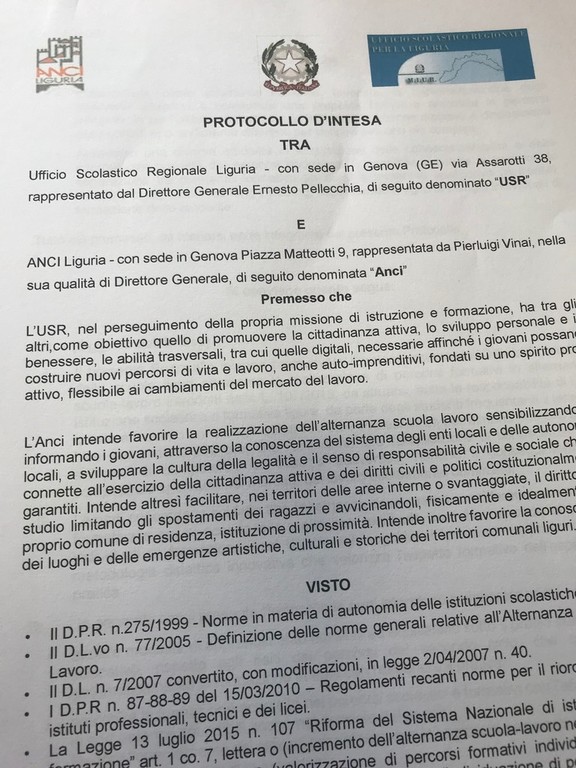 Il direttore generale ANCI Liguria Pierluigi Vinai e il direttore dell’Ufficio Scolastico Regionale Ernesto Pellecchia hanno sottoscritto oggi un protocollo di collaborazione per promuovere i percorsi di alternanza scuola-lavoro nei Comuni liguri e nelle strutture di proprietà degli stessi, come musei civici e biblioteche.