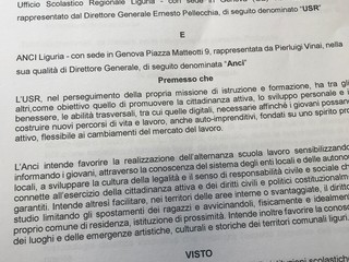 «Grazie all’accordo di collaborazione USR-ANCI si creano le condizioni perché si possa concretamente organizzare, promuovere e svolgere dei percorsi di formazione nelle strutture comunali – afferma il direttore dell’Ufficio Scolastico Regionale Ernesto Pellecchia – Attraverso queste esperienze, si consente ai giovani di istituti tecnici e licei residenti in Liguria di stabilire un contatto diretto con l’ente più importante a livello territoriale locale, che è il Comune. Ma l’alternanza non è solo approccio al mondo organizzato del lavoro – conclude Pellecchia – bensì educazione civica, educazione alla democrazia e attività di orientamento per il futuro dei nostri studenti».
