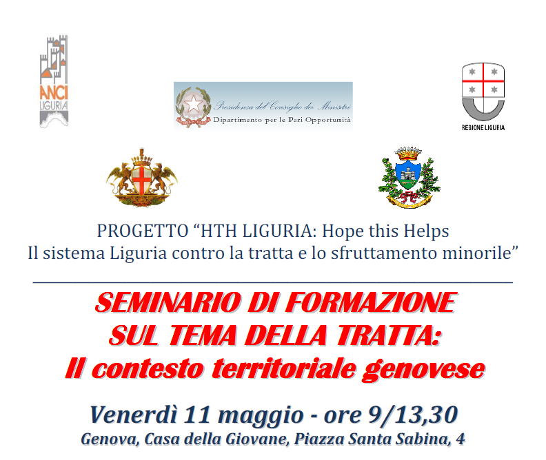 Venerdì 11 maggio dalle ore 9.00, presso la Casa della Giovane di Genova in Piazza Santa Sabina 4, si terrà il primo seminario di formazione sul tema della tratta, con particolare riferimento al contesto territoriale genovese.