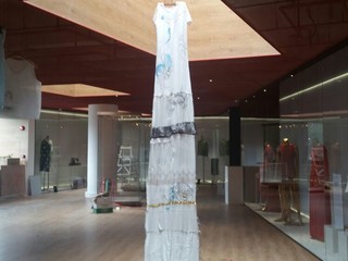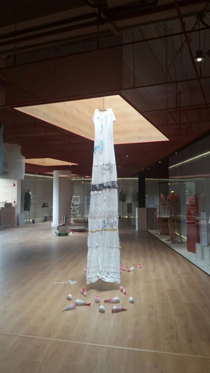Lo sguardo sul mondo, per me, è uno sguardo di costante meraviglia, per cui si tratta di uno spazio emozionale che accoglie la sorpresa, a cui, però, disposti. In questo modo si afferma uno spazio di possibilità, d'inclusione dell’inatteso, di stupore, di osservazione sospesa. Un luogo d’eventualità. Da qui, quindi, nasce la mia opera, un abito di tre metri, appeso, che è lasciato a fluttuale come un fiume. A due estremità i pesci legati lo tengono aperto, svelando all’interno uno spazio accogliente in cui entrare. Si tratta di una sorta di Wunderkammer: ci sono sacchettini trasparenti di stoffa che devono conservare la memoria attraverso simboli, poesie, cartoline, e anche oggetti antichi conservati da Zhao, souvenir dall'Occidente e dall'Oriente. forme, oggetti incontrati, riconosciuti e raccolti, testimoni di un rituale di celebrazione dell'eccezionalità dell'attimo. L'abito fiume lascia scorrere su di sé il tempo e trattiene alcune reliquie del quotidiano, frammenti di un gesto poetico che include tutti. La mia installazione è ora parte delle collezione di Zhao con quella di Maria Jole Serreli. Inoltre la scrittura in cinese ha di per sé una bellezza intrinseca e appese al soffitto c’erano le nostre biografie, come il mio vestito, ed era bello a vedersi. Era un creare, sospeso nel vuoto, una connessione tra artisti e collezione.