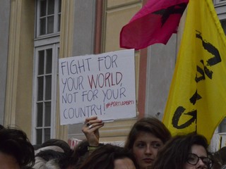 Sui cartelli slogan come "Restiamo Umani" o "Fight for your world, not for your country"; poi striscioni contro Salvini, Lega e Movimento 5 Stelle, ma anche contro il Pd: "Accordo Italia-Libia assassinio di stato, Lega e Pd stessi interessi" si legge su un lenzuolo esposto in De Ferrari.