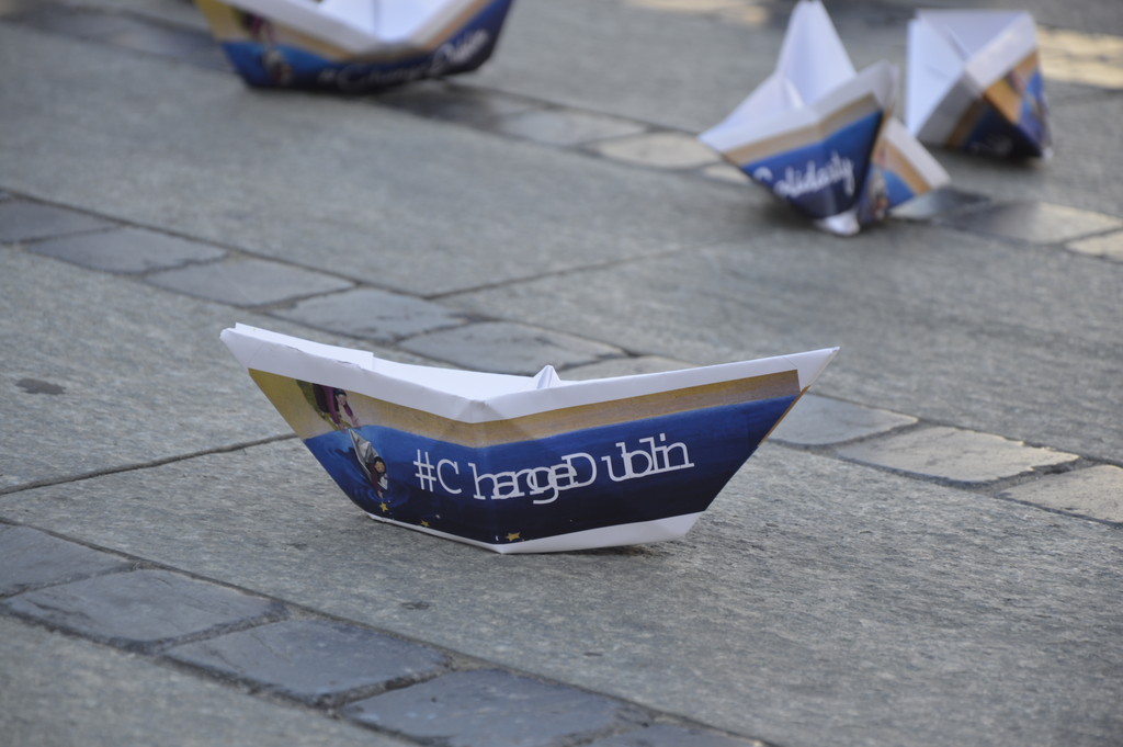 I manifestanti hanno costruito decine di piccole barche di carta con la scritta "European Solidarity" e "Change Dublin", che sono state disposte intorno alla fontana al centro della piazza.