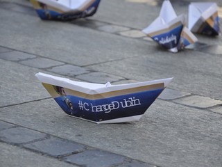 I manifestanti hanno costruito decine di piccole barche di carta con la scritta "European Solidarity" e "Change Dublin", che sono state disposte intorno alla fontana al centro della piazza.