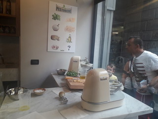 Il pesto lo fanno sul momento in vetrina, secondo la tradizione, mentre il pestello, meccanico pesta come farebbe la mano dell’uomo. Ecco com'è nata l'idea di Luciano Pirlo, tra tecnologia e "Piesta" (VIDEO E FOTO)