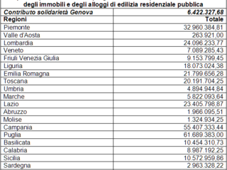 “Si tratta complessivamente di 321 milioni e il contributo di solidarietà per Genova che proponiamo al Governo è pari al 2%. Il fondo dovrà finanziare programmi di recupero dell’edilizia residenziale pubblica, in particolare per quanto riguarda il ripristino degli alloggi anche ai fini dell’adeguamento energetico, degli impianti e del miglioramento sismico degli immobili. Ho poi informato la Conferenza delle Regioni – ha proseguito Toti - sulle relazioni con il Governo per quanto concerne il ‘Decreto per Genova e le infrastrutture”.
