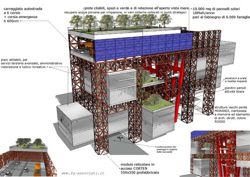 Lo scrive Beppe Grillo nel proprio blog. Si tratta di una proposta di progetto dell'architetto bergamasco Stefano Giavazzi, che ipotizza di non abbattere il ponte e di renderlo abitabile.