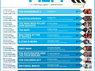 Il programma si estende ininterrottamente dal 24 settembre all’11 dicembre, partendo lunedì 24 e martedì 25 settembre con il film d’animazione The Incredibles 2 di Brad Bird, per proseguire l’1 e 2 ottobre con il nuovo titolo di Spike Lee BlaKkKlansman, la biografia del primo detective americano nero che si infiltra nel Ku Klux Klan. L’8 e 9 ottobre si passa alla fantasia visionaria di Terry Gilliam con The man who killed Don Quixote, interpretato da Jonathan Pryce e Adam Driver. The Wife con Glenn Close e ancora Pryce, il 15 e 16 ottobre descrive la ribellione della moglie che ha dedicato la vita a uno scrittore in procinto di ritirare il premio Nobel per la letteratura. Si passa al thriller con Bad Times at El Royale (22 e 23 ottobre) di Drew Goddard, toccando poi il dramma di un attore in crisi innamorato di un’attrice talentuosa, ovvero A Star is Born (29 e 30 ottobre), con Lady GaGa. A novembre la rassegna prevede First Man (5 e 6 novembre) sulla storia dell’Apollo 11, il fantasy The Nutcracker and the Four Realms (12 e 13 novembre) di Lasse Hallström, due film tratti da altrettanti romanzi di Ian McEwan, The Children Act con Emma Thompson e Stanley Tucci (19 e 20 novembre) e On Chesil Beach (26 e 27 novembre) tratto da Espiazione. Si chiude con un altro fantasy, Fantastic Beasts: The Crimes of Grindewald (3 e 4 dicembre) e con il musical Bohemian Rhapsody (10 e 11 dicembre) sulla storia dei Queen.