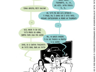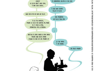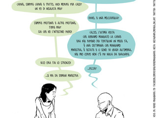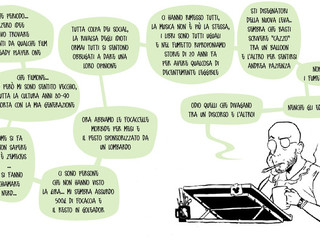 Si tratta di un progetto creato dal nulla. Nasce dal fatto che ho sempre avuto la passione per le vignette e ho iniziato a disegnare guardando “Calvin e Hobbes” di Bill Watterson, quando in Italia c’erano solo quelle di "Lupo Alberto" e "Cattivik", altrimenti le altre erano importate. Da lì ho iniziato a fare le mie, come “Caruggi”, ma anche altre. E adesso, guardandomi intorno e considerando la produzione attuale, ho ripreso questo genere, immaginando due protagonisti e ispirandomi al mio film preferito, “Pulp Ficton”, in cui i personaggi filosofeggiano su argomenti comuni. Ma, dal momento che sono sempre stato dell’idea che il fumetto deve parlare prevalentemente tramite il disegno, e le battute devono essere poche, ho deciso di creare i dialoghi attraverso “balloon” che sembrano messaggi, per esempio di WhatsApp. Poi ho notato, dalla pagina Facebook dedicata a “Voce del verbo: Mugugnare”, che l’interesse si accentuava quando il personaggio sono io stesso mentre parlo con mia moglie o mio figlio, per cui ho deciso di mettere la mia vita ‘in vetrina’ e mi sembra funzioni, anche se inserirò anche altre citazioni.