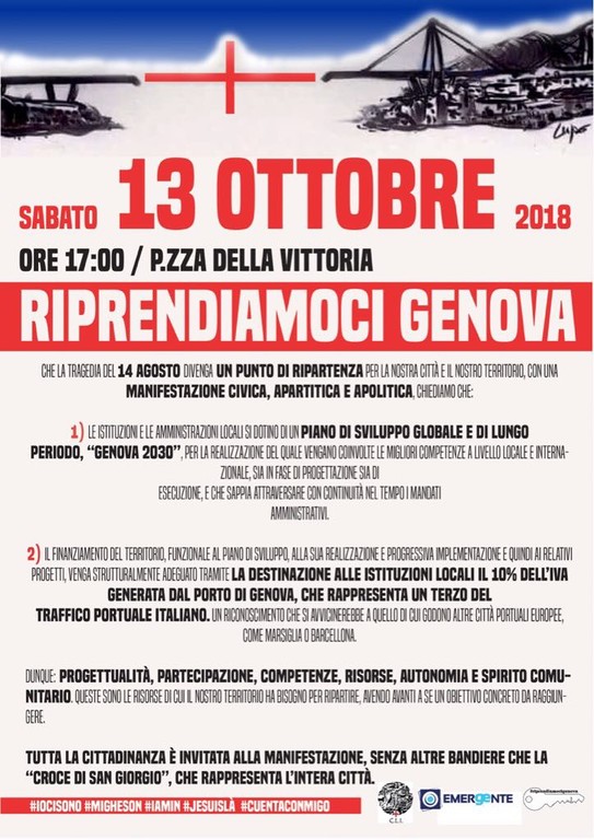 Sabato 13 ottobre, partendo da Piazza della Vittoria, attraversando in corteo via XX Settembre fino a De Ferrari, ci manifesteremo per questi motivi, e dovremo essere migliaia; senza bandiere di partito, ma portando solo la Croce di San Giorgio, che è il nostro emblema. Partiremo da lì e andremo fino al Palazzo della Regione per dimostrare che Genova non se ne sta dell’elemosina, ma deve essere messa in condizione di fare da sé, come ha sempre fatto nella Storia. Se saremo tanti lo Stato italiano ci dovrà ascoltare. È ora che la nostra comunità riprenda in mano il suo destino.