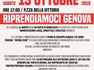 Dopo il corteo organizzato dal comitato "Oltre il ponte c'è" per manifestare per tutta la Valpolcevera dopo il crollo di ponte Morandi, domani, sabato 13 ottobre, ci sarà una nuova manifestazione: "Riprendiamoci Genova".