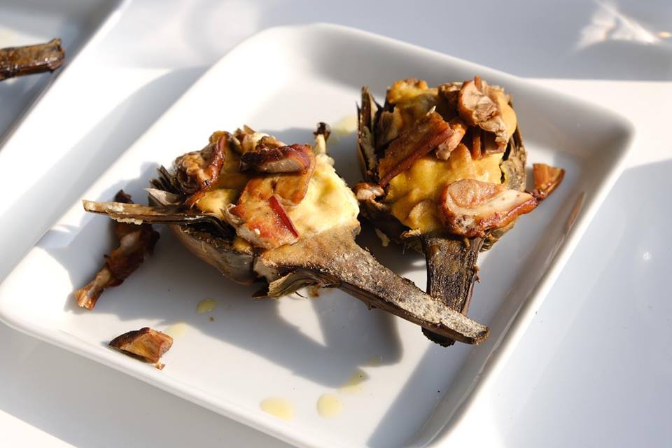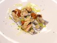 Buridda di Stoccafisso, uno dei piatti della tradizione ligure, reinterpretato dallo Chef e preparato con un’emulsione di Stoccafisso, trippe e sottogola dello stesso – ingredienti che sono inusuali ma che una volta non lo erano – e un cuore di filetto di Baccalà passato nel sale e insaporito con una crema di limone in purezza. Completano il piatto i sapori del territorio essiccati a freddo.