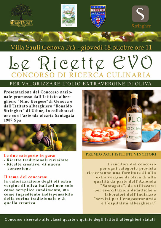 Giovedì 18 ottobre, alle ore 11, parte da Genova (auditorium di Villa Sauli – Podestà, via Prà 70) la prima edizione del concorso nazionale di ricerca culinaria “Ricette Evo”, che ha come tema la valorizzazione dell’olio extra vergine di oliva italiano quale ingrediente primario a tavola e in cucina.