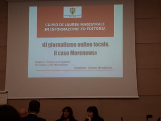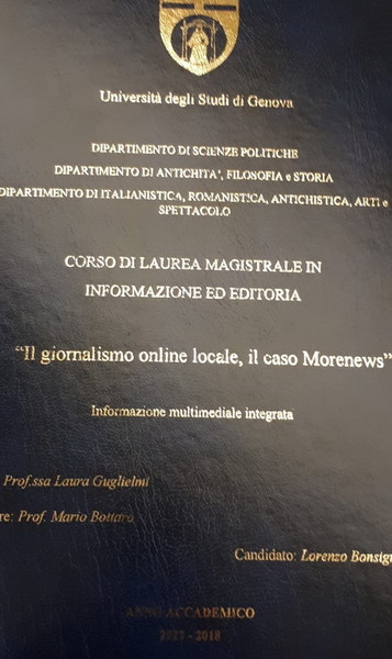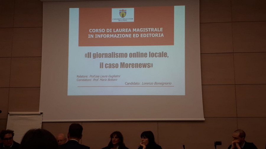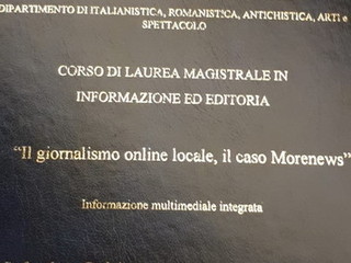 Un 110 e Lode per una tesi sul ‘caso Morenews’ ed il giornalismo on line locale. Lo straordinario consenso lo ha ottenuto quest’oggi il nostro collaboratore Lorenzo Bonsignorio, che si è laureato a Genova in 'Informazione ed Editoria', con una tesi improntata sul nostro gruppo editoriale.