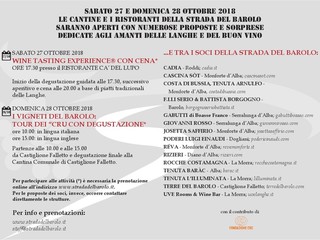 Come ogni anno i soci della “la Strada del Barolo” metteranno a disposizione dei turisti i propri servizi, con una serie di offerte speciali solo per il week-end del 27 e 28 ottobre 2018: gli amanti del Barolo e degli altri grandi vini delle Langhe avranno la possibilità di visitare le cantine in cui si produce il celebre Re dei Vini, potranno incontrare di persona i produttori e degustare i loro vini. Per tutti i buongustai i ristoranti della Strada del Barolo proporranno dei menu ad hoc con i piatti tipici della tradizione langarola, preparati con gli ingredienti più genuini.