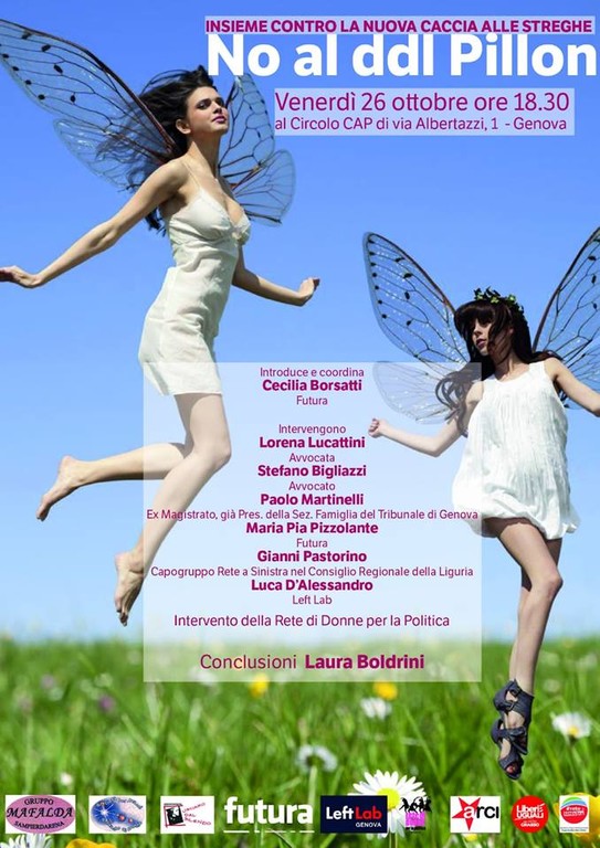 Left Lab e Futura hanno organizzato un evento pubblico per discutere e contestare il ddl Pillon: l'incontro è in programma per venerdì 26 ottobre, alle ore 18.45, presso il Circolo Cap di via Albertazzi, a Genova. L'intervento conclusivo sarà affidato all'onorevole Laura Boldrini, per l'occasione in visita nel capoluogo ligure.