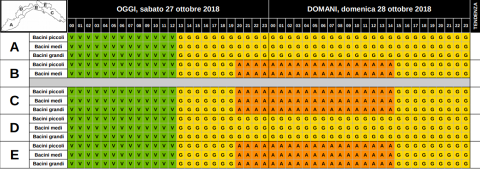 Zone A, D(tutti i bacini): gialla fino alle 23.59 di domani, domenica 28 ottobre.
