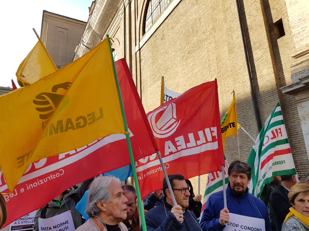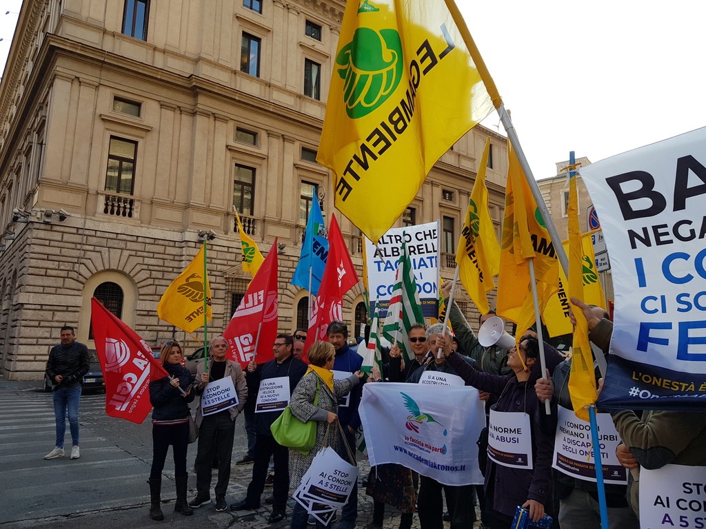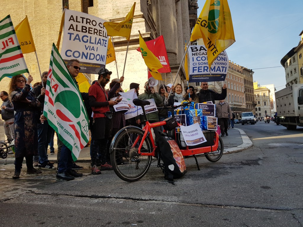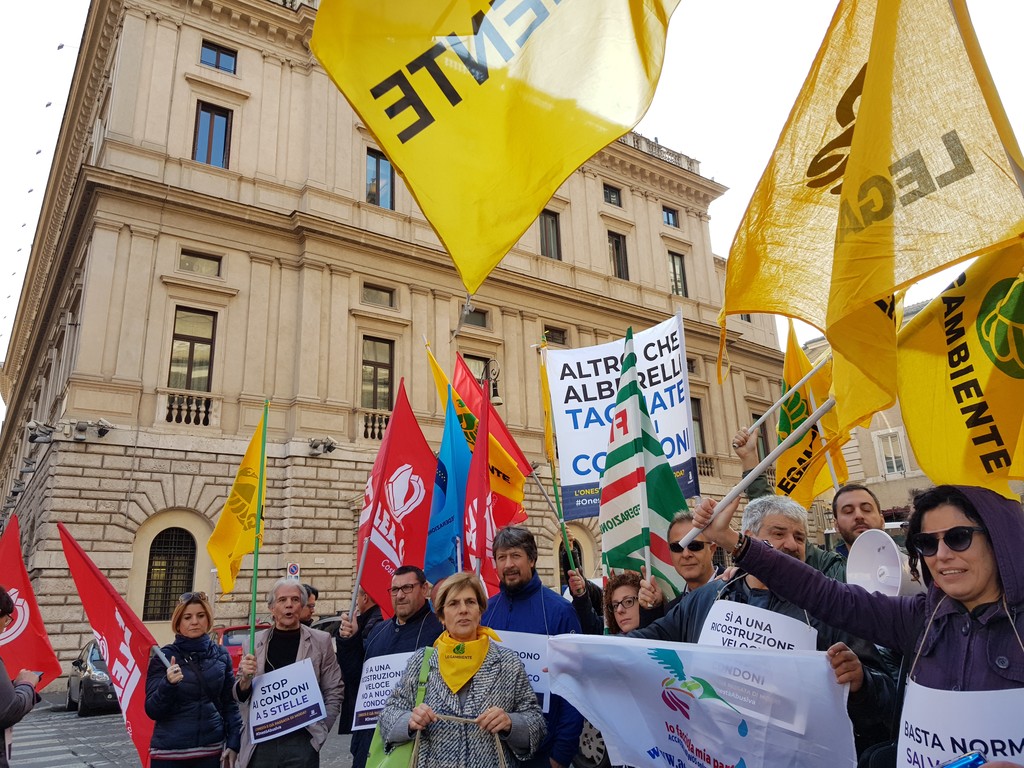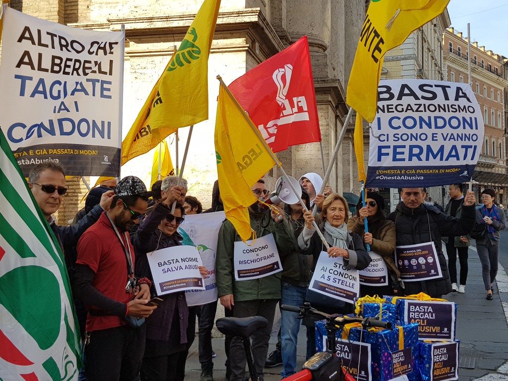 Questa mattina Legambiente ha organizzato un presidio vicino a Palazzo Madama per chiedere al Senato un atto di coraggio e responsabilità modificando il provvedimento e togliendo le norme salva abusi. Un appello sostenuto e condiviso anche da Associazione nazionale costruttori edili, Cgil, Cisl, Uil, Fillea-Cgil, Filca-Cisl, Feneal-Uil, Anci Marche, Consiglio Nazionale Architetti, Coord. Enea Flc-Cgil, Accademia Kronos, Libera, Rete della Conoscenza, Sigea-Società Italiana di Geologia Ambientale e Symbola. "Basta negazionismi, i condoni ci sono e vanno fermati". "Altro che alberello, tagliate via i condoni" sono gli slogan utilizzati durante il presidio.
