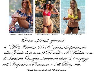 Sono 25 le protagoniste, di cui 14 dalla provincia di Savona (un gruppo che fa la parte del leone), sette da quella di Imperia, tre dalla provincia di Genova e una da Bergamo, di Miss Inverno 2018 che si contenderanno la corona di regina dell'inverno questa sera, 9 dicembre dalle 21 nell'Auditorium della Camera di Commercio di Imperia.