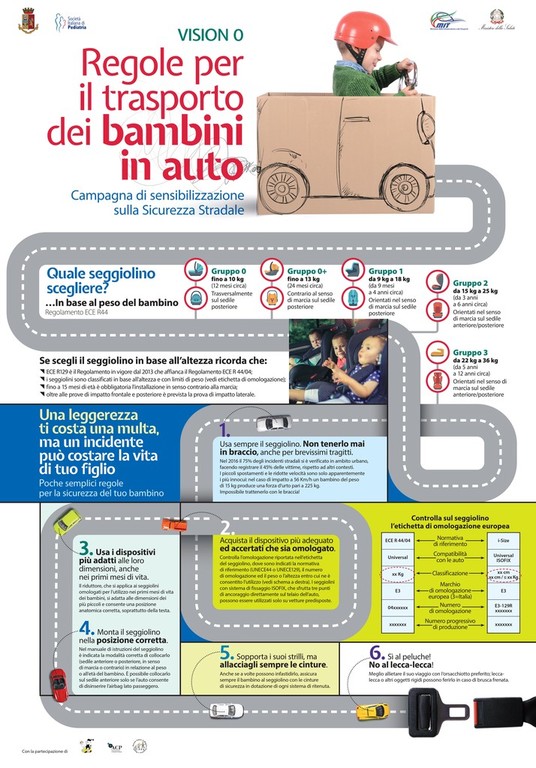 Ricordiamo che in Italia, infatti, gli incidenti stradali sono la principale causa di morte nei bambini tra gli 0 e i 14 anni, che il 40% degli incidenti mortali si verifica su percorsi urbani inferiori ai 3 chilometri e che nella maggior parte dei casi i bambini che hanno perso la vita non erano assicurati con gli appositi sistemi di ritenuta. Nell’ambito dell’iniziativa sono stati realizzati pieghevoli e poster contenenti informazioni utili per guidare i genitori nella scelta del seggiolino più idoneo per i propri bambini, che saranno distribuiti negli studi medici pediatrici, nei consultori e nei reparti di ginecologia ed ostetricia delle strutture ospedaliere.
