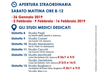 Nei prossimi quattro sabati – 26 gennaio, 2 febbraio, 9 febbraio e 16 febbraio – a Genova sarà aperto al mattino, con orario dalle 8 alle 12, uno studio medico di medicina generale in ciascun distretto della Asl3.