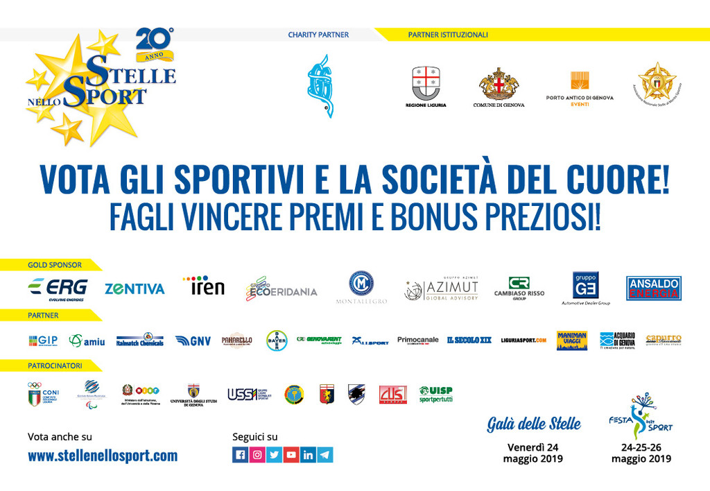 Urne aperte, riparte Stelle nello Sport, il progetto promosso sotto l’egida di Regione Liguria, Comune di Genova, Coni e Cip. Si vota ogni settimana, fino al 3 maggio, per eleggere gli sportivi e le società dell’anno. Derby del voto al via nella categoria del Rossoblucerchiato dell’Anno-Trofeo EcoEridania. Lo scorso anno furono Quagliarella e Pandev i più “acclamati”. Partenza a razzo per Sanabria e lo stesso Quagliarella. Le categorie BIG Maschile-Trofeo Erg e BIG Femminile-Trofeo Villa Montallegro celebrano gli sportivi maggiorenni. Caccia ai successori degli olimpionici Lorenzo Sommariva e Roberta Bianconi. I migliori talenti tra i 14 e i 18 anni si votano nella categoria Junior Maschile-Trofeo Cambiaso Risso e nella categoria Junior Femminile-Trofeo Zentiva. I Campioni del futuro (under 14) emergeranno nella categoria Green-Trofeo Ansaldo Energia.