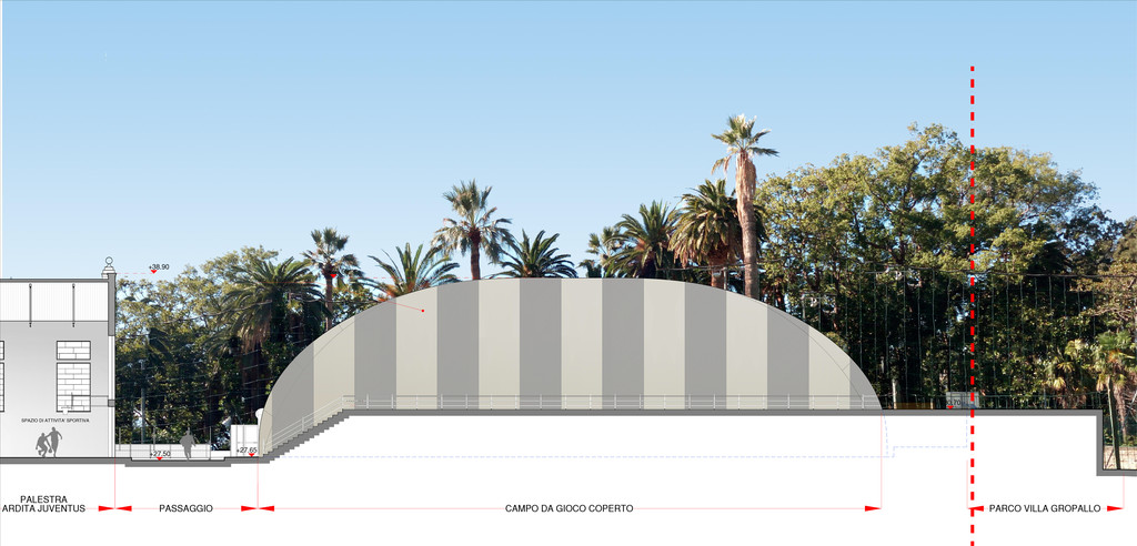 Il progetto è basato sulla copertura stagionale del campo principale all'aperto, riqualificato e restituito all’uso per giochi di squadra (basket e volley) per uso semi-professionistico (fino alla Serie C regionale).