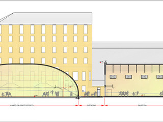 Negli spazi esterni i campetti minori saranno riqualificati con la rimozione degli attuali suoli impermeabili e l'adozione di soluzioni nature-based, nel quadro di una complessiva attenzione alle qualità e al pregio del parco nel quale la struttura è inserita.