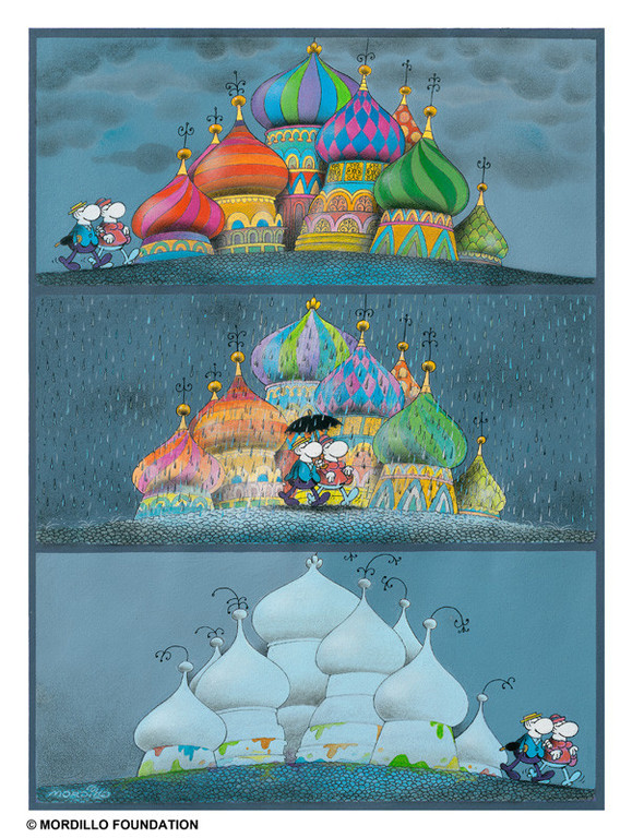 Nato in Argentina nel 1932 Guillermo Mordillo si forma come fumettista e autore di cartoon di animazione, distinguendosi come disegnatore tra i più pubblicati in numerosi Paesi, sin dai primi anni ’70. Dopo il trasferimento a Parigi negli anni ’60, Mordillo vive un momento di grande notorietà grazie alla realizzazione di opere uniche, caratterizzate da colori vivaci e da uno straordinario senso umoristico impersonato dai suoi buffi e pacifici personaggi, che non utilizzano la parola per esprimersi, bensì una divertente gestualità. Diverse le situazioni in cui li abbiamo visti comparire a volte sportive, romantiche, esilaranti e surreali, catturando inevitabilmente l’attenzione e la fantasia. Mordillo, inoltre, ha sempre dato ampio spazio alla raffigurazione artistica che ha per protagonista la natura e gli animali, in particolar modo le giraffe, le cui avventure sono state raccolte in diversi volumi di incredibile successo.