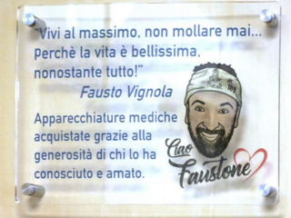 Nel reparto di Ematologia e Oncologia del centro genovese da mercoledì è presente in qualche modo anche Faustone, così lo chiamavano gli amici, con il suo viso sorridente su una targa che recita: "Vivi al massimo, non mollare mai… perché la vita è bellissima nonostante tutto!".