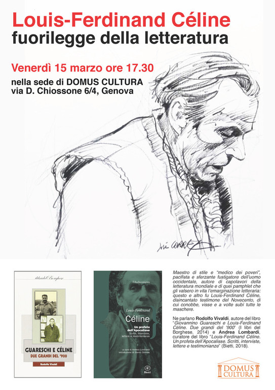 Venerdì 15 marzo alle ore 17.30 nella sede di Domus Cultura di Via Chiossone 6/4, si terrà la conferenza: Louis-Ferdinand Céline, fuorilegge della letteratura.
