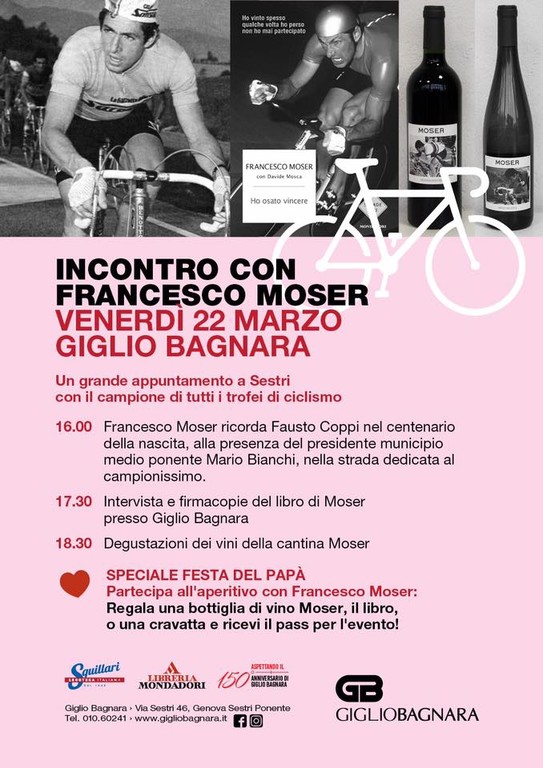Ed è bello che tutto questo, domani (venerdì 22 marzo), si riassuma in un unico pomeriggio, proprio qui, dalle nostre parti. Francesco Moser sarà a Sestri Ponente, in una serie di eventi organizzati da Giglio Bagnara, in collaborazione con l’Enoteca Squillari e il Mondadori Bookstore.