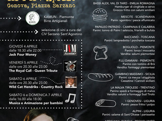 Unico comune denominatore il panino, antesignano della più moderna gastronomia street food e sinonimo di tradizione culinaria nostrana. Inoltre, sarà possibile acquistare in loco i prodotti tipici regionali protagonisti della proposta gastronomica: dal tomino del Piemonte, alla mortadella emiliana, dal pecorino sardo alla frisella della Basilicata un vero e proprio tour del gusto, accompagnato dalla selezione di 8 differenti tipologie di birre artigianali alla spina di Kamun e alla selezione di beverage a cura del Civ di Sarzano e Sant’Agostino.