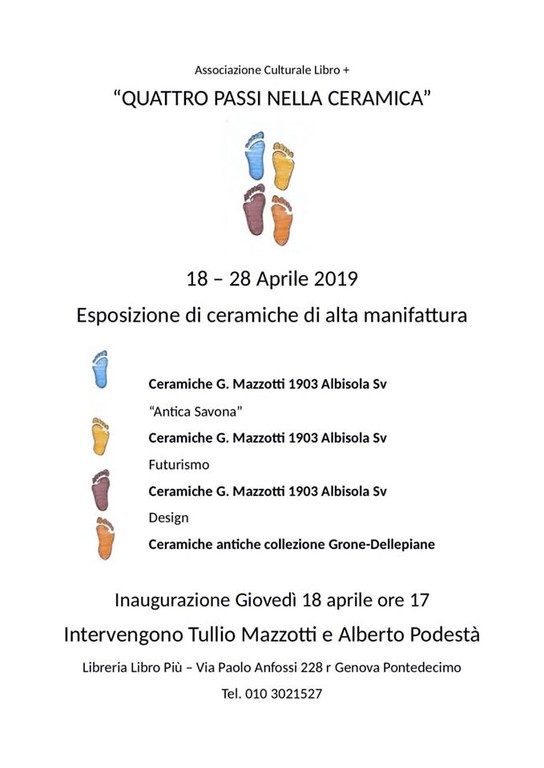 "Quattro passi nella ceramica" il titolo della mostra che sarà visitabile fino al 28 orari 9-12,30 e 15,30 – 19,30 ingresso libero. Quattro passi come le quattro tematiche affrontate l’Antica Savona, il Futurismo, il Design e l’Antiquariato con una serie di unicità provenienti dalla collezione Grone/Dellepiane.