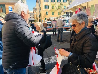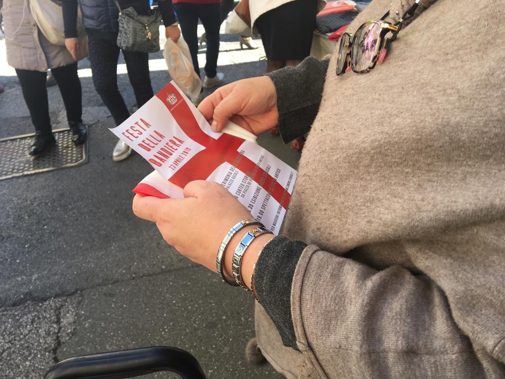 La bandiera con la croce di San Giorgio viene distribuita in occasione della ricorrenza: l'iniziativa ha preso il via presso il mercato di piazza Palermo, e continuerà nei prossimi giorni in numerosi altri siti cittadini