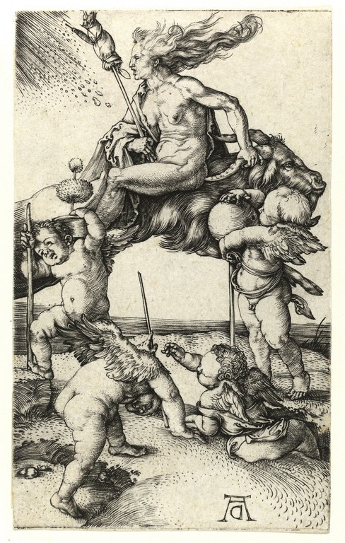 In mostra 54 bulini e 2 acqueforti, che consentono al visitatore di seguire l’evolversi dello stile e della perizia tecnica dell’artista e i cambiamenti di registro nelle diverse tematiche da lui affrontate: dalle prime stampe, in cui l’influenza dei maestri nordici precedenti è più evidente, come “La sacra famiglia con la libellula” (1495 c.) o “Giovane donna insidiata dalla morte” (1495 c.), alla creazione di uno stile personalissimo, con immagini dalla complessa e affascinante simbologia, come “La grande fortuna” (1501 c.) o “La strega cavalca una capra” (1505 c.), bulini fondamentali per la comprensione dell’iter artistico di Dürer sia per l’altissimo virtuosismo tecnico che per la profondità psicologica e la ricchezza di significati simbolici.