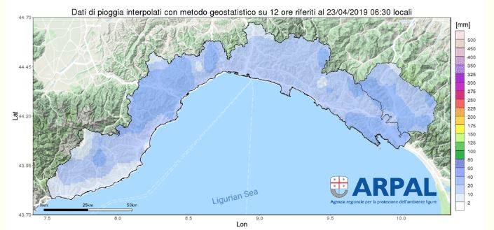 Precipitazioni finora deboli con cumulate nelle ultime 12 ore da segnalare di 40.6 a Ferrania (Savona), 36.6 millimetri al Colle del Melogno (Savona), 29.6 a Stella Santa Giustina (Savona), 26.8 a Pratomollo (Genova), 22.6 a Santo Stefano d’Aveto (Genova).