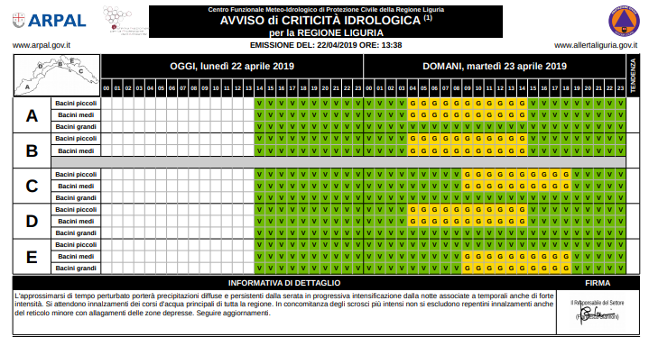 Secondo le previsioni di Arpal oggi, martedì 23 aprile, cielo molto nuvoloso o coperto e deboli precipitazioni caratterizzano questa mattinata di allerta gialla per piogge diffuse e temporali sulle zone A, B, D fino alle 15, mentre alle 9 lo stesso livello di allerta scatterà per le zone C ed E e proseguirà fino alle 19.