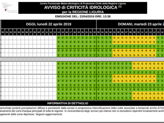 Secondo le previsioni di Arpal oggi, martedì 23 aprile, cielo molto nuvoloso o coperto e deboli precipitazioni caratterizzano questa mattinata di allerta gialla per piogge diffuse e temporali sulle zone A, B, D fino alle 15, mentre alle 9 lo stesso livello di allerta scatterà per le zone C ed E e proseguirà fino alle 19.