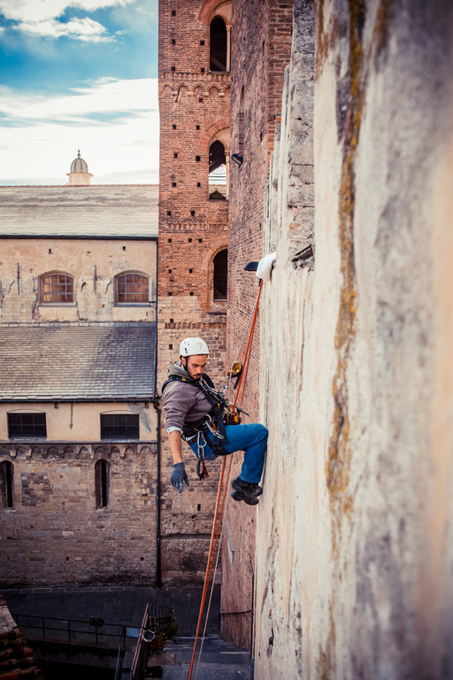 A proposito di restauro, spiegano ancora i titolari: “Noi abbiamo varato nel 2014 le tecniche in quota, ma da quel momento con cadenza più o meno biennale abbiamo organizzato dei controlli sulle opere restaurate. A noi piace fare l’esempio dell’autovettura, chiaro a tutti: ci sono lavori importanti, come ad esempio la cinghia della distribuzione, che si possono fare ogni 100.000 km circa; però una volta sostituita la cinghia ci sono tanti piccoli controlli molto più frequenti da fare per essere certi che il veicolo circoli sempre in condizioni di assoluta sicurezza ed efficienza, come i cambi d’olio, le gomme, le pastiglie dei freni. Un parallelismo evidente è quello con la Torre Nolare dell’Abbazia di San Fruttuoso in provincia di Genova: nel 2014 è stata oggetto di restauro in quota da parte della nostra azienda. Nel 2015, a un anno esatto dal termine dei lavori, abbiamo fatto la prima verifica, seguita da un’altra nel 2016 e, da lì in poi, con cadenza biennale. La successiva è stata infatti condotta nel 2018”.