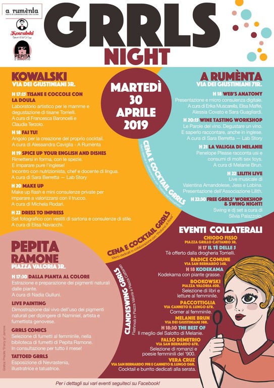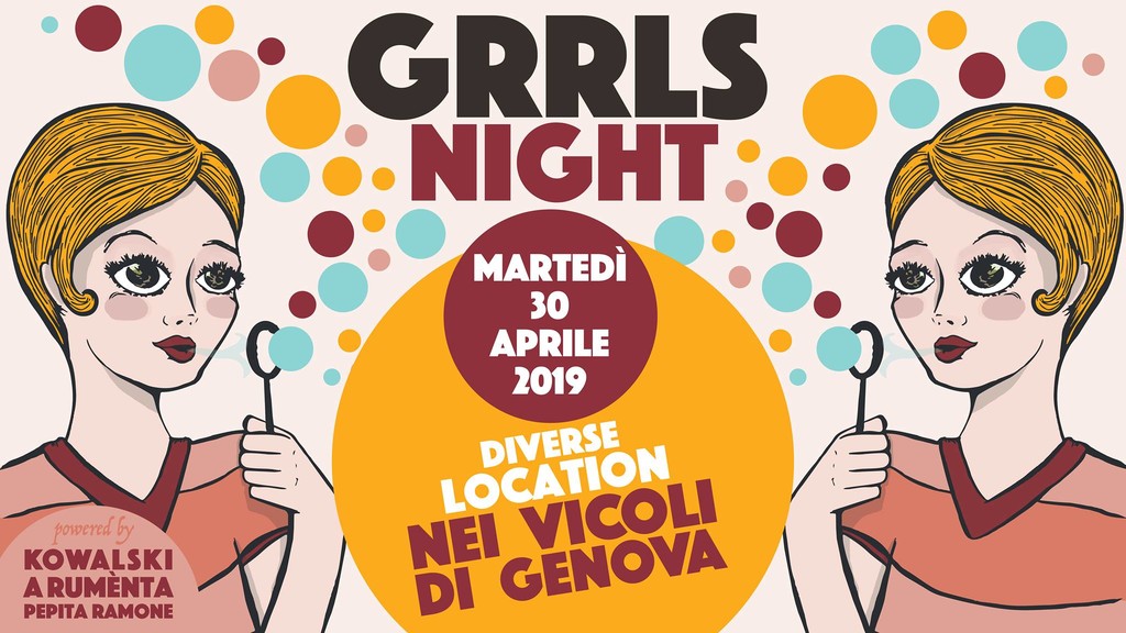 Martedì 30 aprile 2019, a partire dalle 17 in diverse location, si svolgerà a Genova la seconda edizione della GRRLS NIGHT: il progetto, un vero e proprio format tutto femminile, è nato nel maggio dello scorso anno al Kowalski di Via dei Giustiniani come una serata-evento ed è poi cresciuto nel corso di questi mesi grazie alla grande partecipazione ed interesse suscitati, fino alla creazione di un vero e proprio team di produzione di eventi dove le donne sono protagoniste.