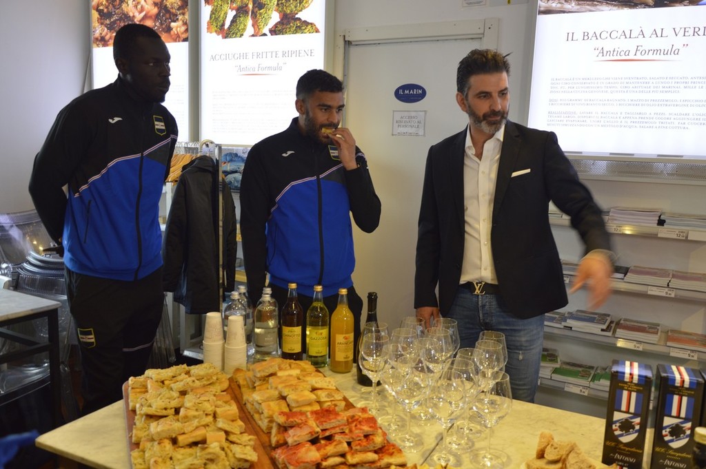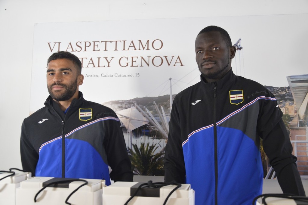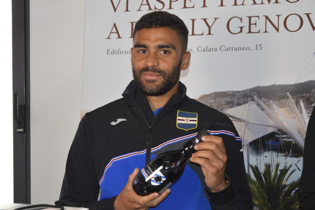 Presentazione del nuovo articolo che sarà presente sugli scaffali di Eataly oggi in Porto Antico, con la firma delle prestigiose bottiglie da parte di Omar Colley e Grégoire Defrel (FOTo e VIDEO)