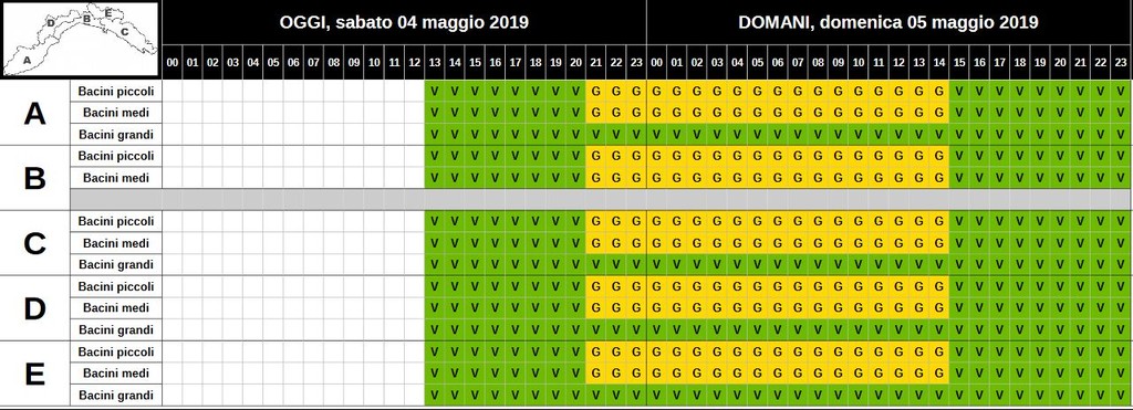 Saranno interessate TUTTE LE ZONE DI ALLERTAMENTO (bacini medi e piccoli) dalle 21 di oggi SABATO 4 MAGGIO alle 15 di domani DOMENICA 5 MAGGIO.