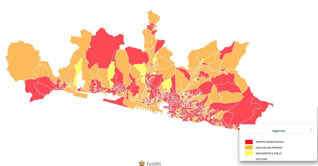 Osservando la cartina del Comune di Genova, si colora di rosso, oltre al Ponente, anche la Valpolcevera, gran parte del centro storico e buona parte del Municipio Levante. La Lega, invece, domina a Sestri Ponente, a Sampierdarena, ad Albaro e nell’alta Valbisagno. È vero che si tratta di un voto Europeo, quindi slegato dalle logiche dell’amministrazione comunale, ma una verifica, in questi termini, gli attuali governanti di Palazzo Tursi sono chiamati a farla. È sufficiente liquidare la questione con il discorso dei ‘fortini rossi’ oppure questo Pd primo partito a Genova è il segnale di qualcosa che comincia a non funzionare?