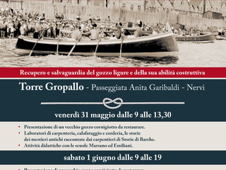 Venerdì 31 maggio dalle 9 alle 13.30 e sabato 1° giugno dalle 9 alle 19, in passeggiata Anita Garibaldi a Nervi nell’area di Torre Gropallo, proseguiranno le iniziative di “Salviamo il Gozzo Cornigiotto!” dedicate alla salvaguardia, al recupero e all’abilità costruttiva della tipica barca da pesca ligure (originariamente prodotta a Corniglia) il cui valore storico è oggetto di una proposta di inserimento tra i beni immateriali patrimonio dell’umanità dell’Unesco presentata dal Mu.Ma Galata Museo del Mare e dall'associazione culturale Storia di Barche.