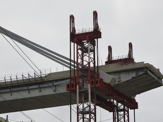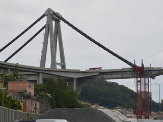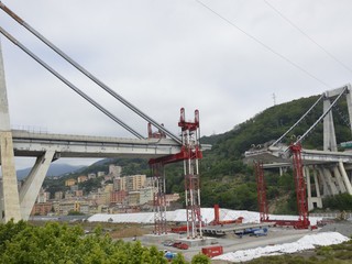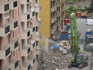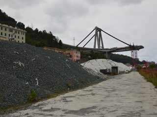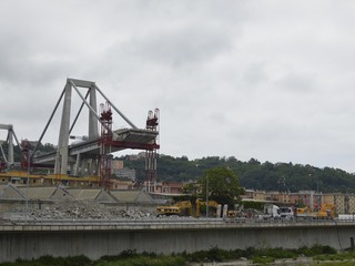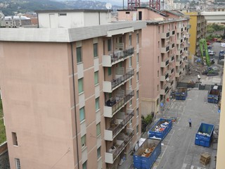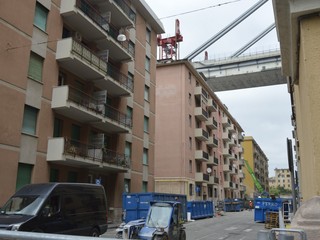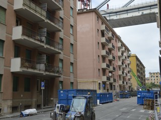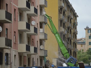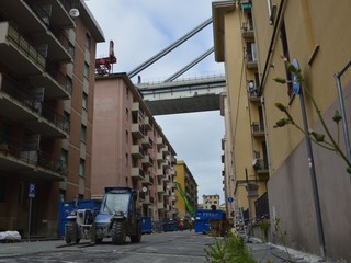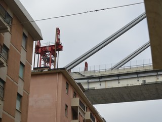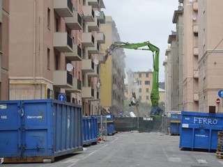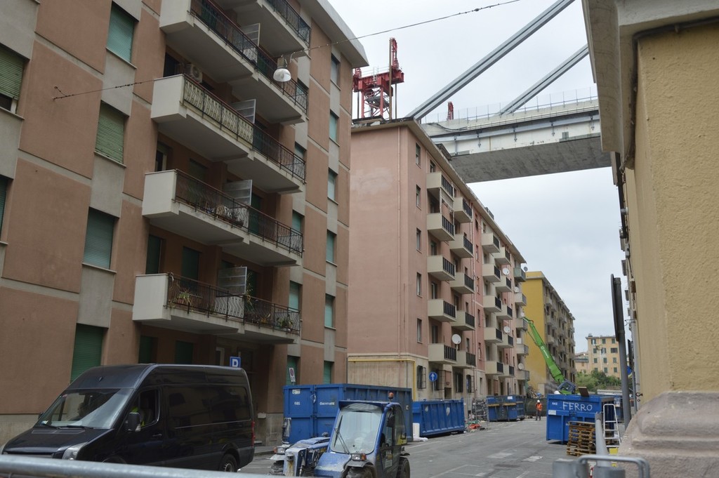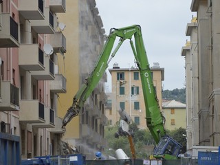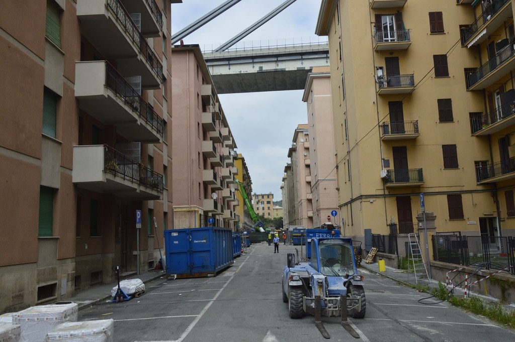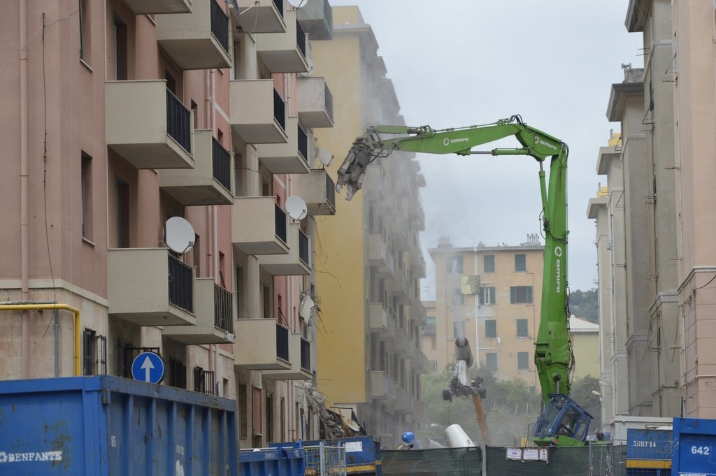 Mezzi pesanti al lavoro per buttare giù gli stabili sotto il moncone del ponte, in attesa della demolizione con l'esplosivo: immagini e video dalla zona rossa e dalla zona arancione