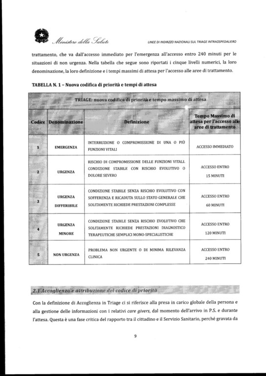 A stabilirlo sono le "Nuove linee d'indirizzo nazionali su Triage Intraospedaliero" trasmesse alle Regioni.