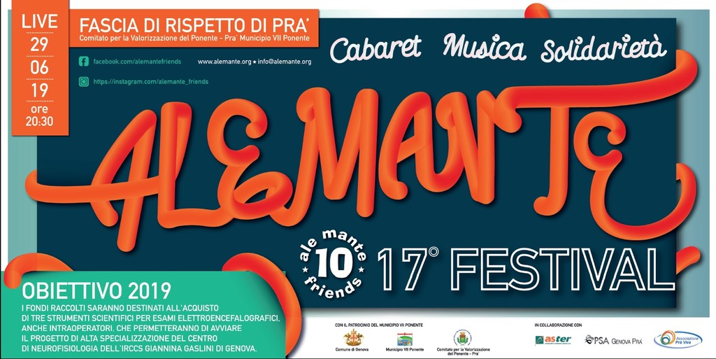 Come sempre, l’Alemante Festival ha il patrocinio di Comune di Genova, Municipio VII Ponente e Comitato per la Valorizzazione del Ponente - Pra’. Collaborano alla realizzazione Aster, Associazione Pra’ Viva e Psa Genova Pra’.